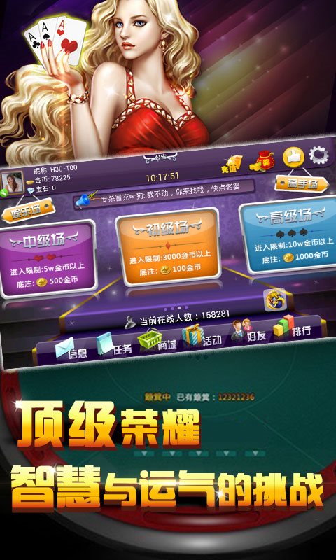 3、让你快速熟练掌握经典玩法,时刻进行一个欢乐的互动竞技,安全绿色的游戏环境,界面细致的在线棋牌娱乐。
